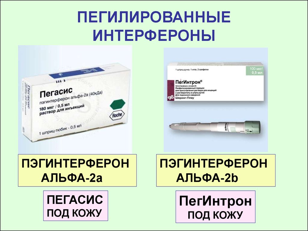 В начале 2000 года на смену «коротким» интерферонам пришли пегилированные интерфероны. Их принцип действия был намного дольше – в течение семи суток. Удалось добиться такого эффекта за счет модернизированной формулы. Такой метод позволил стабилизировать концентрацию действующего вещества в крови человека, позволяя делать инъекции всего лишь один раз в неделю.