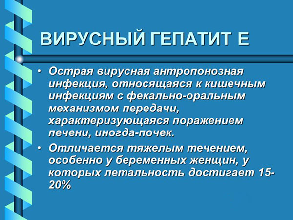 Всем известно, что существует несколько видов гепатита, а именно A, B, C, D и Е. В нашей стране гепатит Е встречается крайне редко, в большей степени он распространен в жарких странах. Но из-за постоянной миграции населения в последнее время появились случаи диагностирования заболевания и в нашей стране. В Европе на тип Е приходится не более 1% случаев заражения, в России это показатель в некоторых областях может достигать 10%.