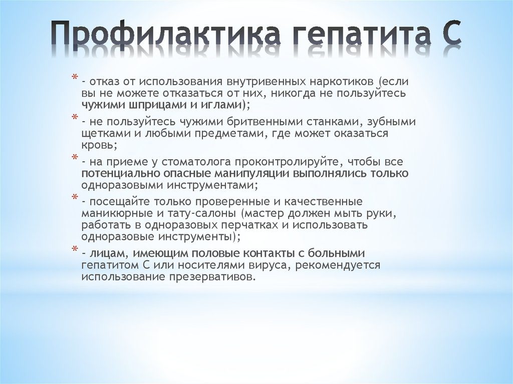 Всегда легче предупредить, чем потом лечить. Вакцины против гепатита С на данный момент не существует, есть только экспериментальные варианты. Основная профилактика – это сокращения риска воздействия вируса HCV в группах повышенного риска (наркоманы, беспорядочные половые связи) и в медицинских учреждениях.