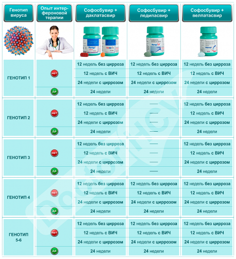 В РФ наиболее часто используются две схемы: Софосбувир и Дакталасвир и Софосбувир и Ледиспавир (избирательно действует на генотипы I, IV).