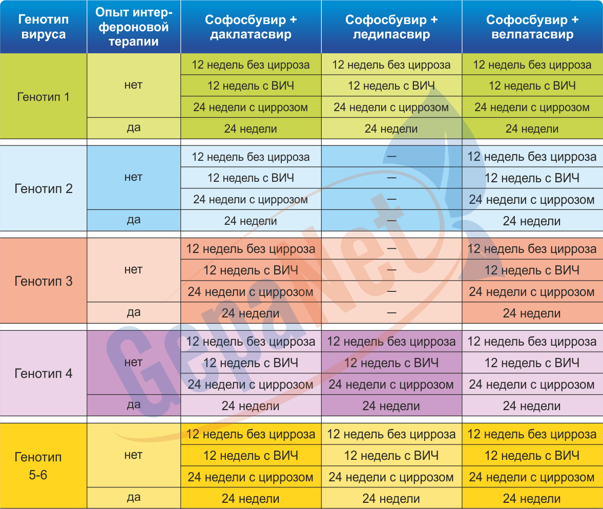 ВНИМАНИЕ! Схемы лечения на нашем портале размещены для ознакомления. Самый оптимальный и результативный курс противовирусной терапии может назначить только Ваш лечащий врач, знающий историю болезни. При необходимости к предложенным схемам он может добавить Рибавирин (в наиболее тяжелых случаях).